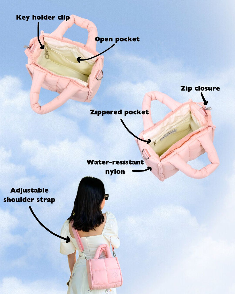 This Mini Puffy Tote is so puffy it could pass for a cloud! It's so spacious inside, with 2 handy internal pockets and a clip for your keys - it's the perfect sidekick for everyday errands. Choose how to rock it with the detachable and adjustable strap - crossbody, on the shoulder, or in hand!