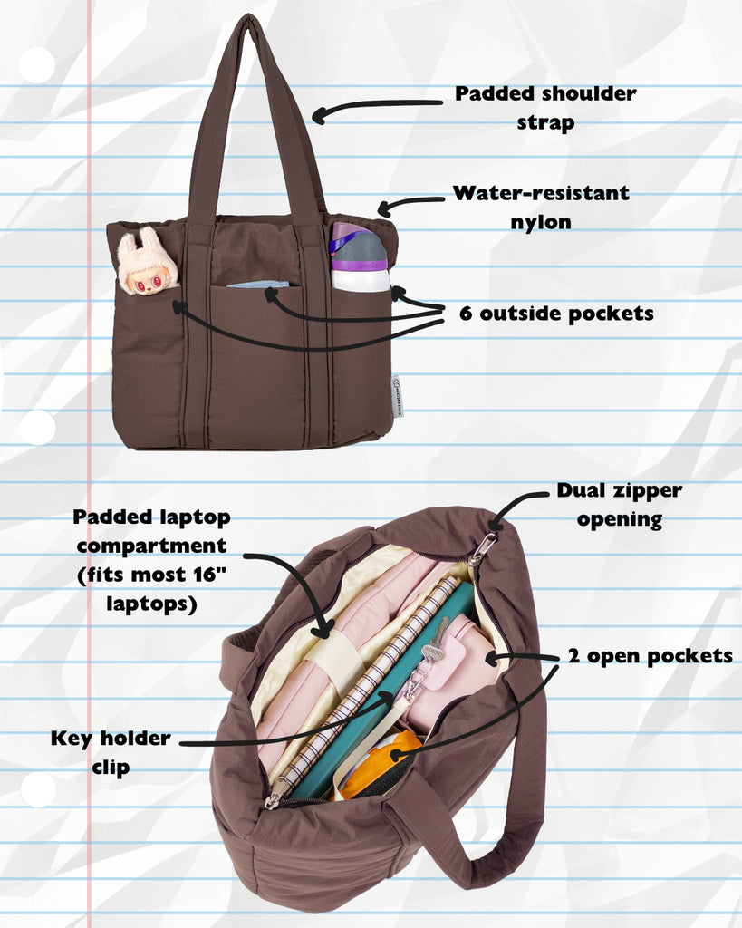 Say hello to the Puffer Tote—your new everyday essential. Made from water-resistant recycled nylon, it’s soft, padded, and packed with pockets to keep you organised. With 6 outer pockets, 2 roomy inner pockets, and a padded laptop compartment that fits most 16” laptops, it’s built for wherever the day takes you. Plus, a dual-zippered top and key clip keep everything secure and easy to find.